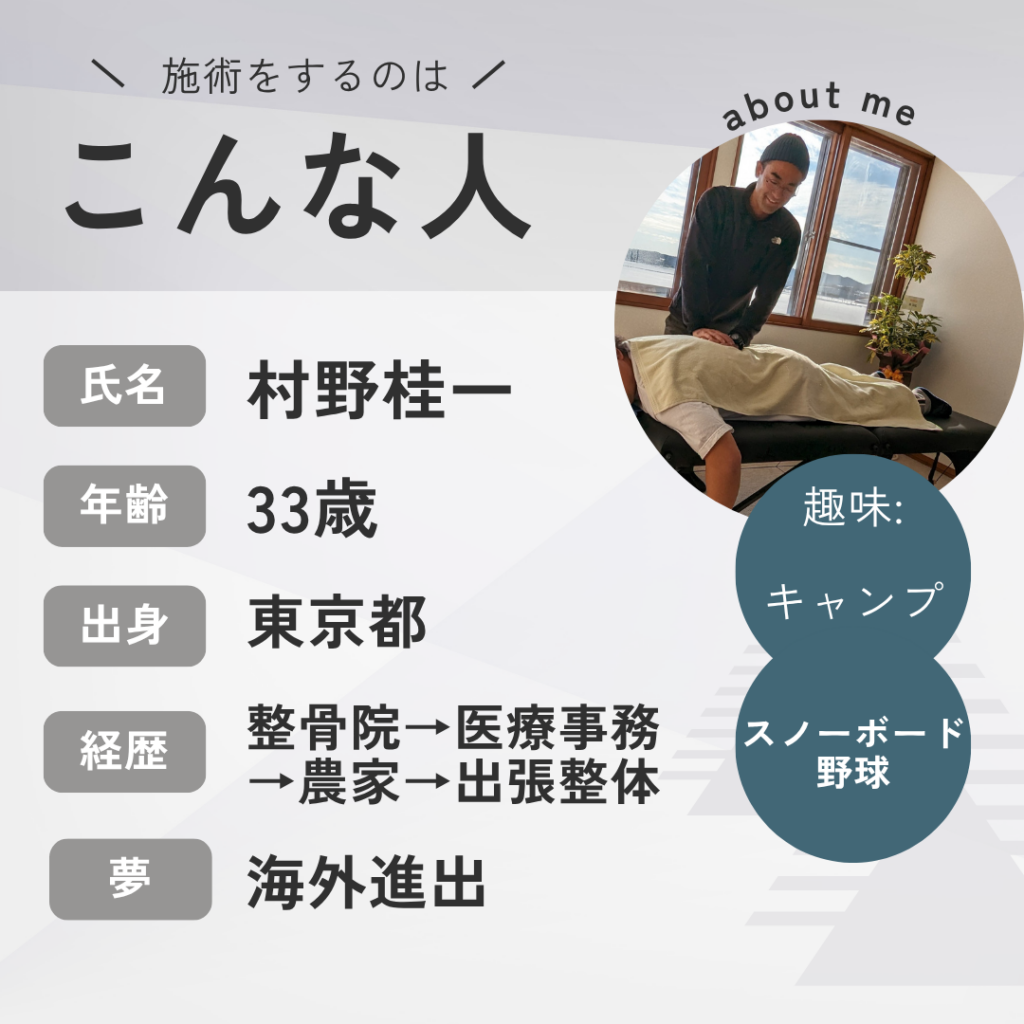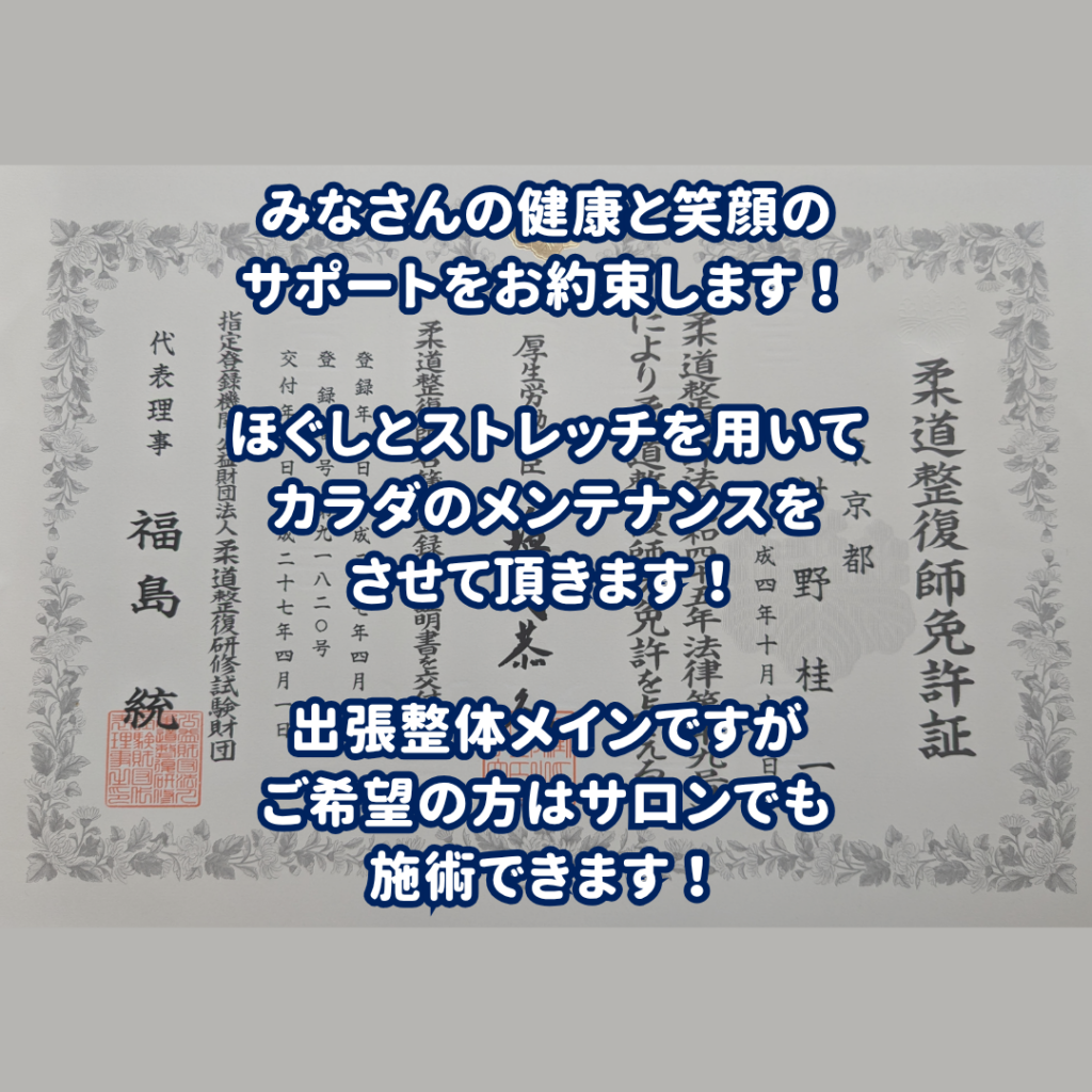 国家資格である柔道整復師を取得後、整骨院やリラクゼーションサロンにて7年間にわたり経験を積み、これまでに延べ約13,000人の施術を担当してきました。