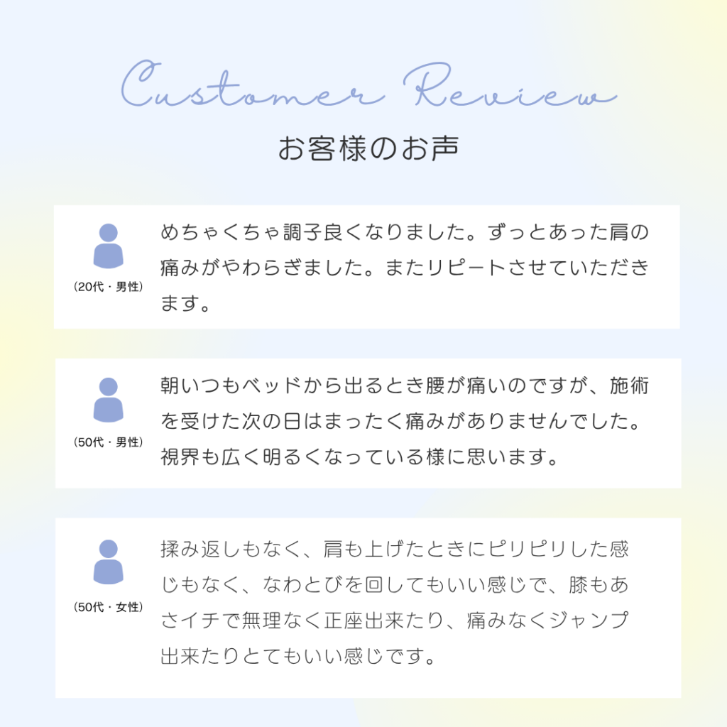 一人ひとりの体の状態やお悩みに丁寧に向き合い、その日のコンディションに合わせた無理のない施術を心がけています。
